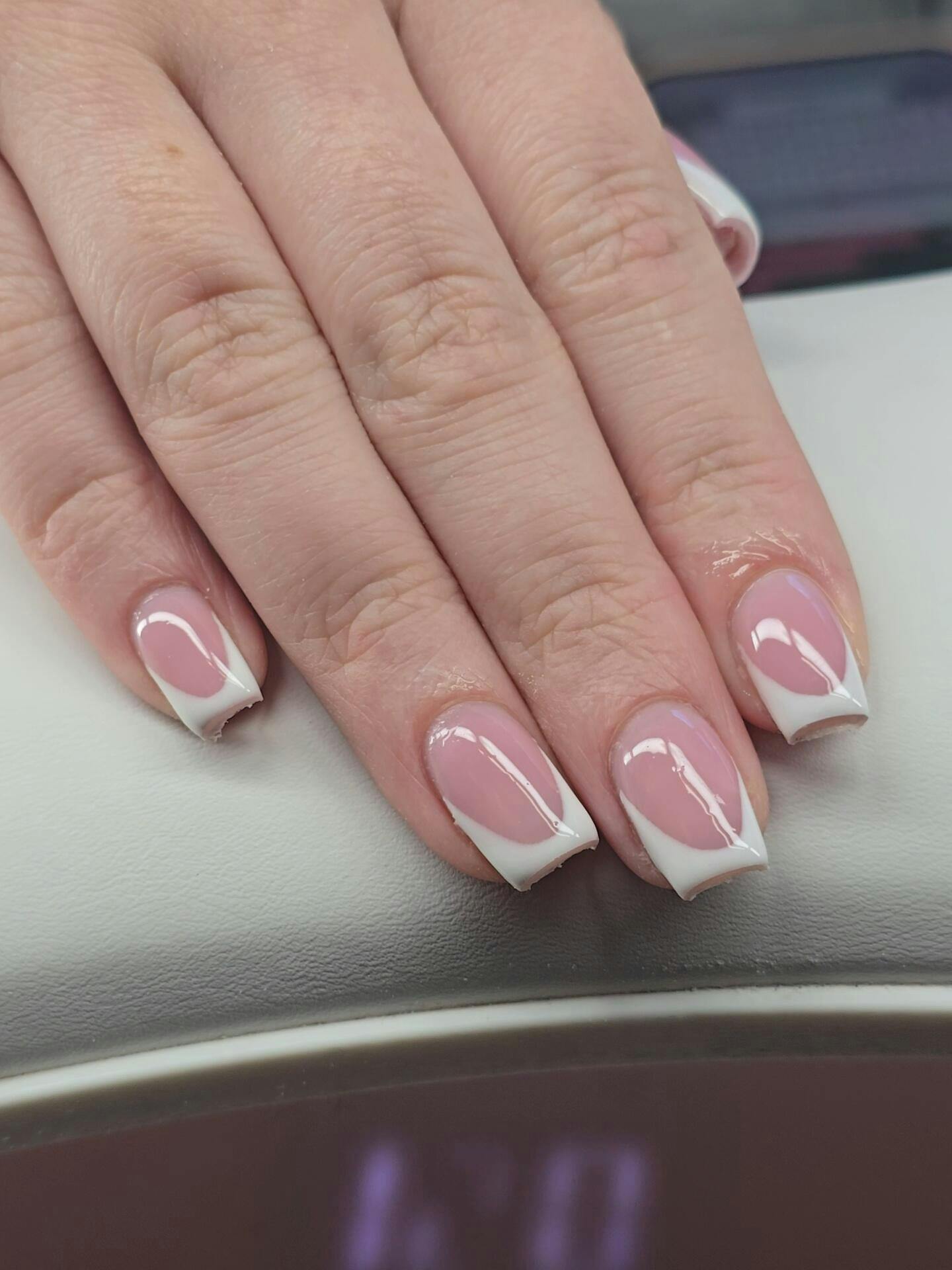 - Apply the first thin coat of pink builder gel, alternating between thick and thin layer